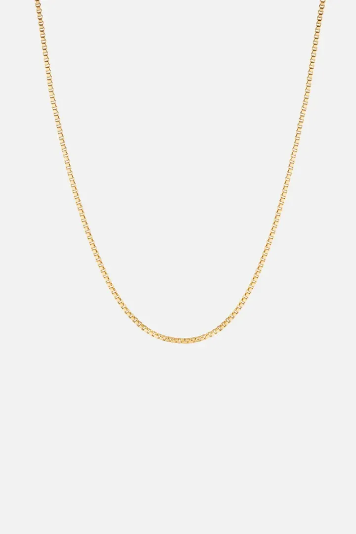 The BOX Chain by Cainte is a timeless gold necklace featuring a refined box-link design. Its polished finish and versatile style make it perfect for casual wear or formal occasions. Lightweight yet durable, this necklace is crafted to be a staple piece in any jewelry collection.