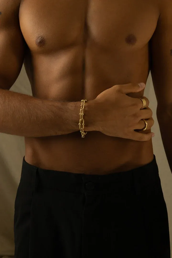 Make a bold statement with the ESSENCE 12MM BRACELET, a striking gold bracelet designed for style and confidence. Its wide 12mm design offers a luxurious and eye-catching look, perfect for both casual and formal occasions.